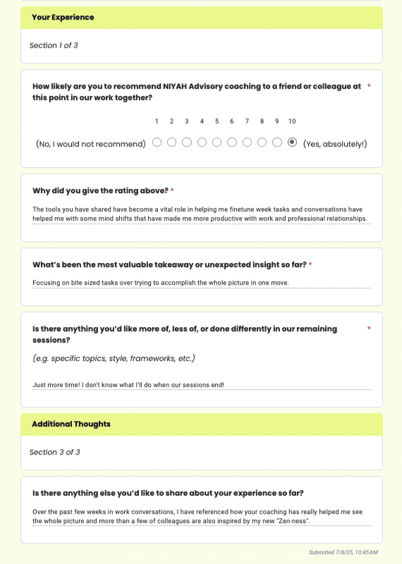 A mid-point client survey came in last week — and it lit me up. K.M. is the kind of client I dream of working with: deeply committed to growth, taking the tools we explore and running with them. She’s showing up, leaning in, and investing in her transformation.